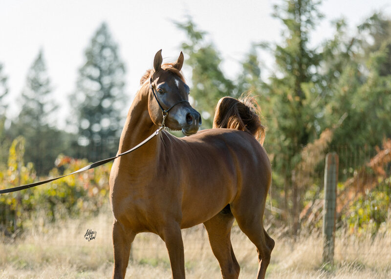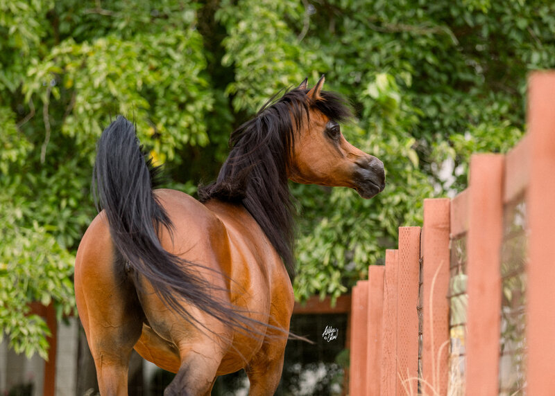 Evelyn C is a gorgeous bay mare with a beautiful face, huge eyes, sexy hair, and tons of charisma. She's by the phenomenal producer Ever After NA and out of the Genesis C daughter Gwendolyn C, dam of champions. Gwendolyn C is full sister to the aristocrat mare Genevieve C, dam of National Champions and Arabian Breeders World Cup Champions alike. Evelyn C is also the dam of 2019 Arabian Breeders World Cup Gold Champion Yearling Legacy Colt, Grand Prix NA. Evelyn C foaled a beautiful bay filly *Dominic M in March 2021.